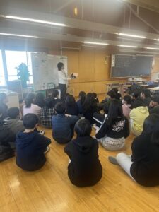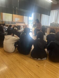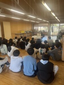 俳優の板垣李光人さん作の自己肯定感が上がりそうなかわいい絵本と、蜘蛛の糸を紙芝居で読んでくださいました。文学作品も絵を見ながらだとイメージしやすかったと思います。子どもたちから自然と拍手がおこりしっかりと聞いてくれていました。
